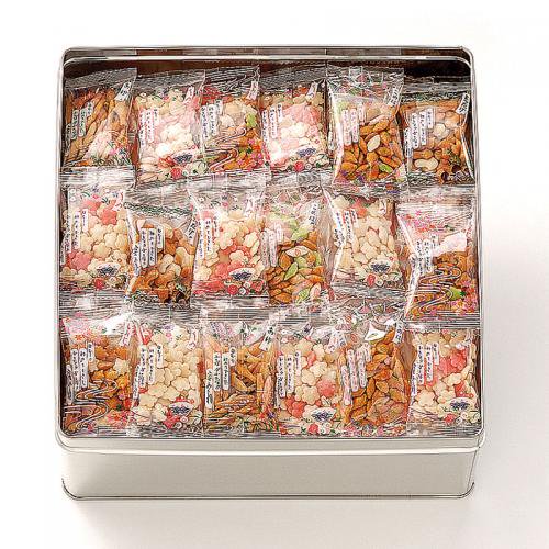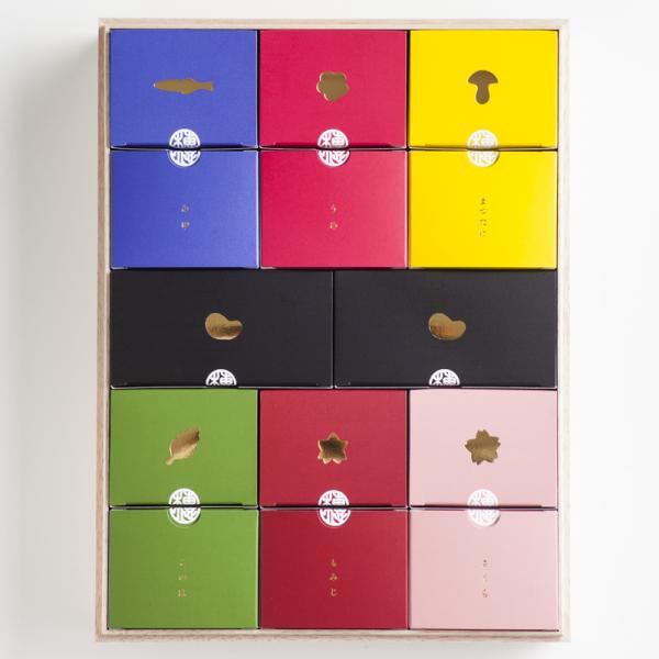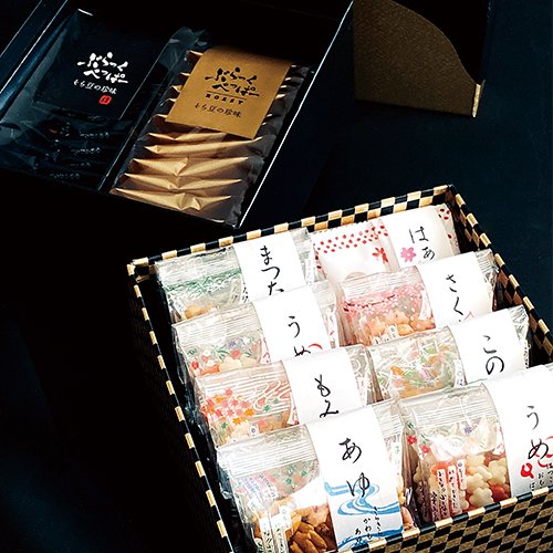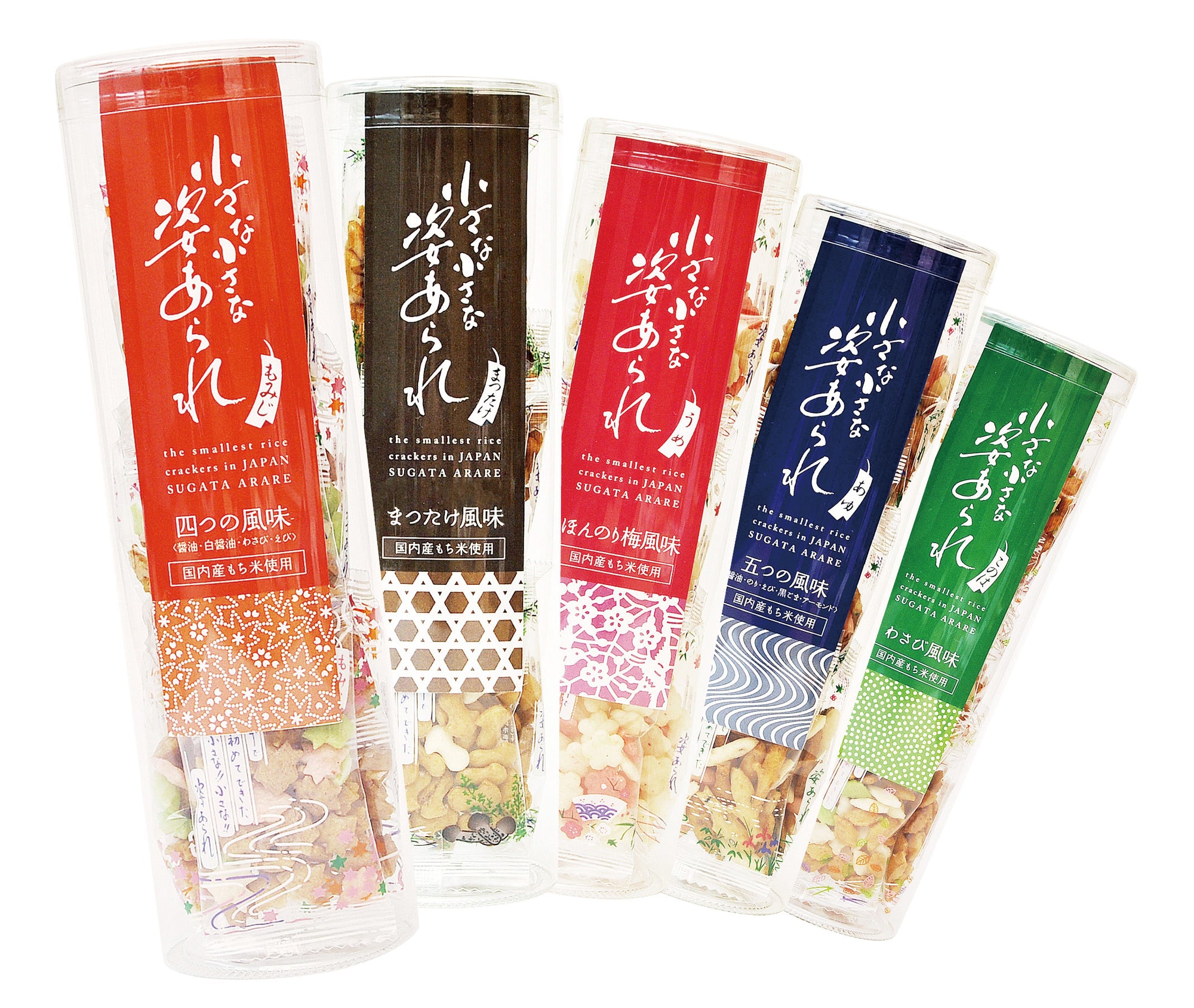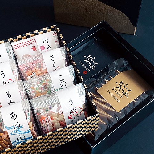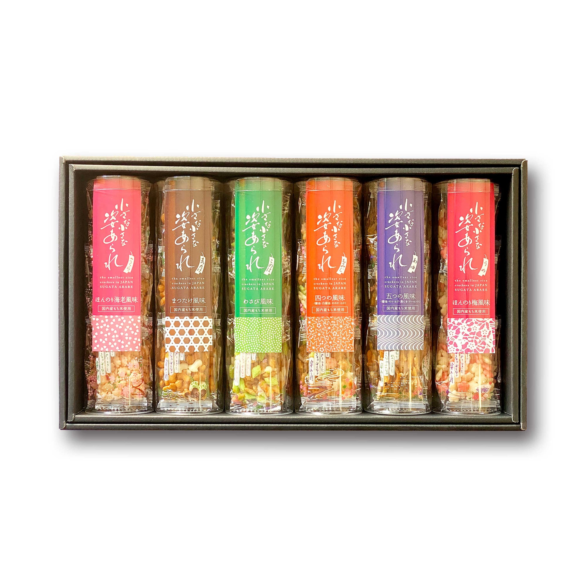 姿あられが全種(さくら、うめ、あゆ、もみじ、このは、まつたけ)と人気のブラックペッパーが楽しめるあられセットです。